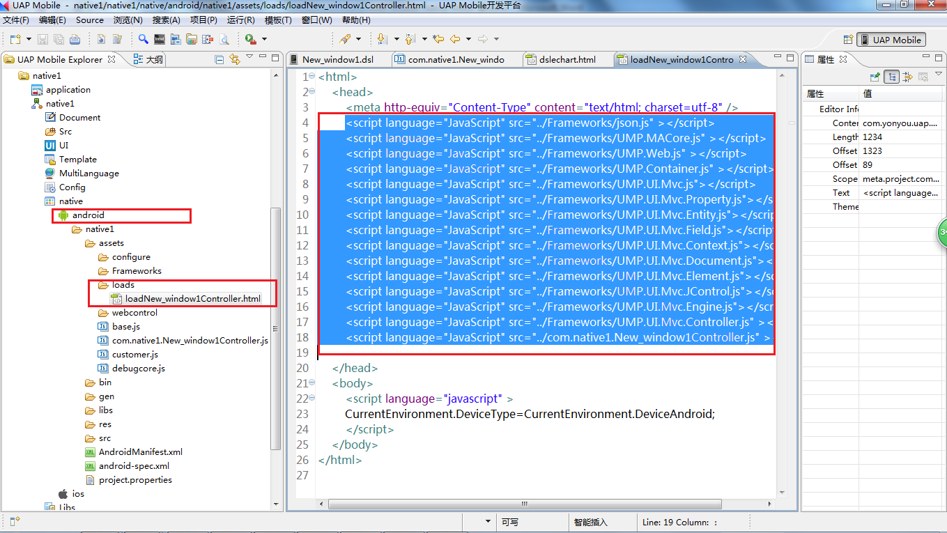 【小技巧】你可以在当前dsl工程下的 ativeandroid工程名assetsloads下打开一个html,将他的引用部分复制到你的WebControl的HTML中。如下图所示